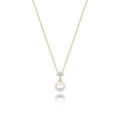 18ct Gold 7mm Round Akoya Pearl And Diamond 0.06ct Cluster Pendant In A 16"-17.5" Trace Chain.