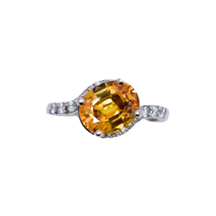 18ct White Gold Ring With 0.27ct FGVS Total Round Brilliant Shoulder Diamonds Set With A 3.07ct Oval Cut Yellow Treated Sapphire IGR Certified. This ring has been created in a size N and can be resized up or down by 2 sizes.