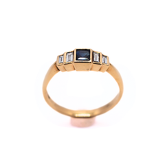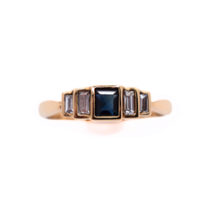 8ct Yellow Gold Rubover Set Five Stone Ring With 0.37ct Dark Blue Sapphire Octagon Centre And 0.20ct Diamond Baguettes Tapering In Two Sets To Shoulders Diamonds Are G/h Colour And Si Clarity In Our Opinion. This ring has been created in a size N and can be resized up or down by two sizes.