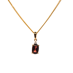 An elegant 9ct Yellow Gold cushion shaped Garnet four claw set and accented with approx. 1.26ct of round brilliant Diamond inn a trefoil design, on free moving polished bail arm.