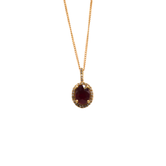 An elegant 18ct Yellow Gold Ruby halo design pendant. The centre stone measures 8x6mm in size, weighing 1.60ct, a AA graded stone. An the pendant is accented with micro claw set Diamonds around the halo and on the bail arm totalling approx. 0.12ct.