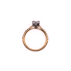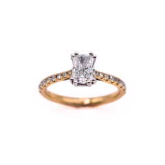 A beautiful claw set courted profile band with round brilliant natural diamond shoulders totalling 0.26ct in 18ct yellow gold with a double claw set 18ct white gold head, set with a stunning radiant cut laboratory grown IGI certified diamond weighing 1ct D colour and VS1 clarity. This ring has been created in a size L and can be resized up or down by two sizes.