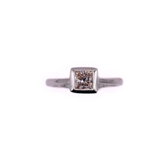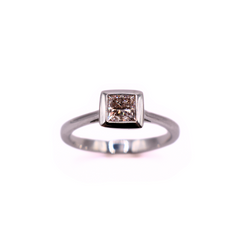 A beautiful collette set courted profile tapered shoulders band in 18ct white gold, set with a stunning Princess cut laboratory grown IGI certified diamond weighing 0.50ct fancy light orange pink colour and VS2 clarity. This ring has been created in a size M and can be resized up or down by two sizes.