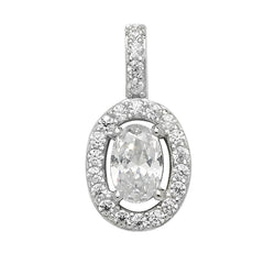 Silver Oval Shaped Four Claw Cubic Zirconia Grain Set Halo Pendant With Gap Around Stone On Stone Set Fixed Bail Arm