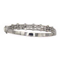 18ct White Gold Handmade Three Strand Diamond Set Bangle Holding 20 Collet Set Round Brilliant Diamonds In An Alternate Pattern Of Size Weighing A Total Of 1.30ct In F Colour And Vs Clarity In Our Opinion With A Ramp Clasp Fastener And Two Figure Of 8 Security Catches