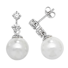 Silver Large Pearl Dropper With Two Round Brilliant Claw Set Cubic Zirconia Above And Butterfly Backs.