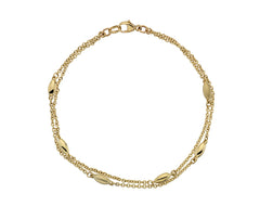 9ct Yellow Gold Two Strand Trace Chain Bracelet With Solid Polished And Frosted Oval Beads And Lobster Clasp.