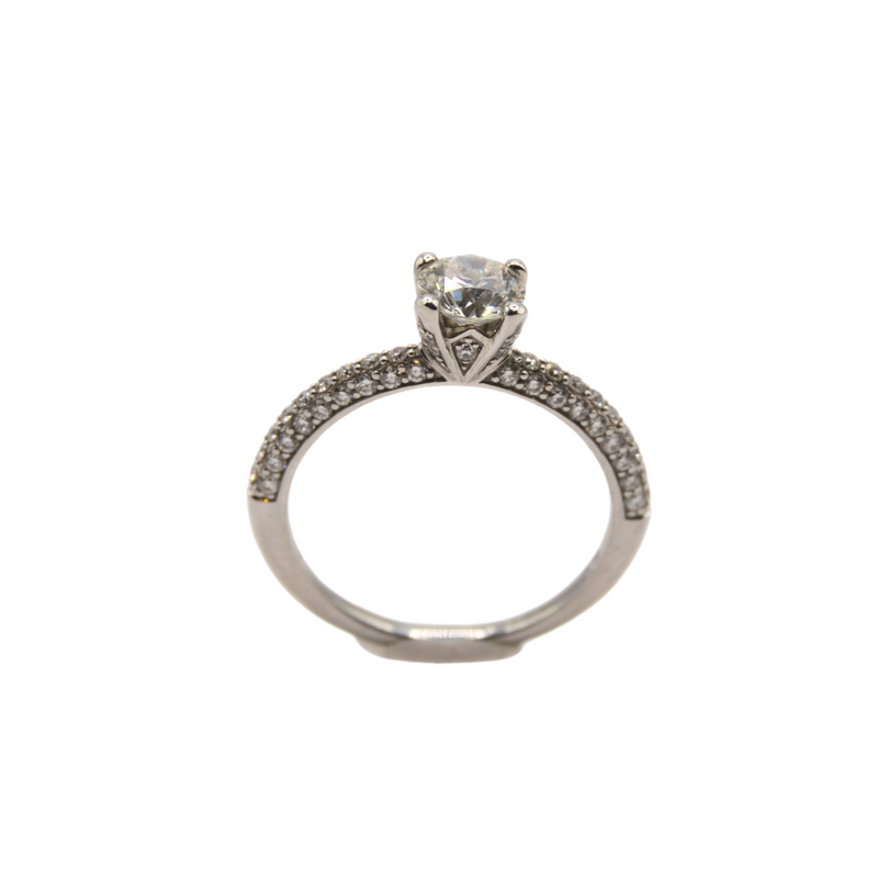 A classic four claw mount in Platinum with micro pave set round brilliant diamond shoulders on all sides approx. 0.52ct. Set with a stunning round brilliant centre diamond weighing approx. 0.70ct G colour and VS2 clarity in our opinion. Total diamond weight approx. 1.22ct. This ring has been created in a size N and can be resized up or down by two sizes.