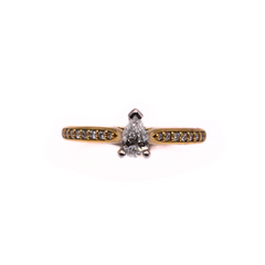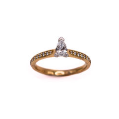 A beautiful grain set courted profile band with round brilliant natural diamond shoulders totalling 0.15ct in 18ct yellow gold set in a claw set white gold head is a stunning pear cut laboratory grown IGI certified diamond weighing 0.30ct E colour and VS1 clarity. This ring has been created in a size N and can be resized up or down by two sizes.