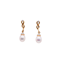 18ct Yellow Gold Pear Shaped Cultured Pearl Dropper Earring Studs. The Droppers Have A Small Infinity Symbol Set With One Diamond And A Diamond Encrusted Cap Setting. Butterfly Scroll Backs.