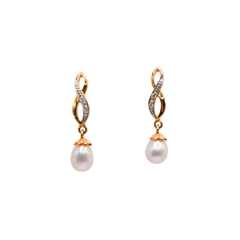 18ct Yellow Gold Infinity Style Pear Shaped Cultured Pearl Dropper Earrings with Two Small Diamonds In A Rhodium Setting Along The Infinity Sign with butterfly Back Studs.