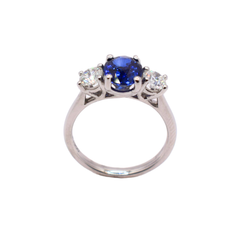 Platinum Sapphire And Diamond Three Stone Ring. Claw Settings Carrying One Oval 8x6.5mm Blue Sapphire Weighing 1.84ct In Weight. The Sapphire Colour Is Described As AAA Royal Ceylon. The Two Round Brilliant Diamonds Total 0.74ct And Are In My Opinion GVS Colour And Clarity. This ring has been created in a size M and can be resized up or down by two sizes.