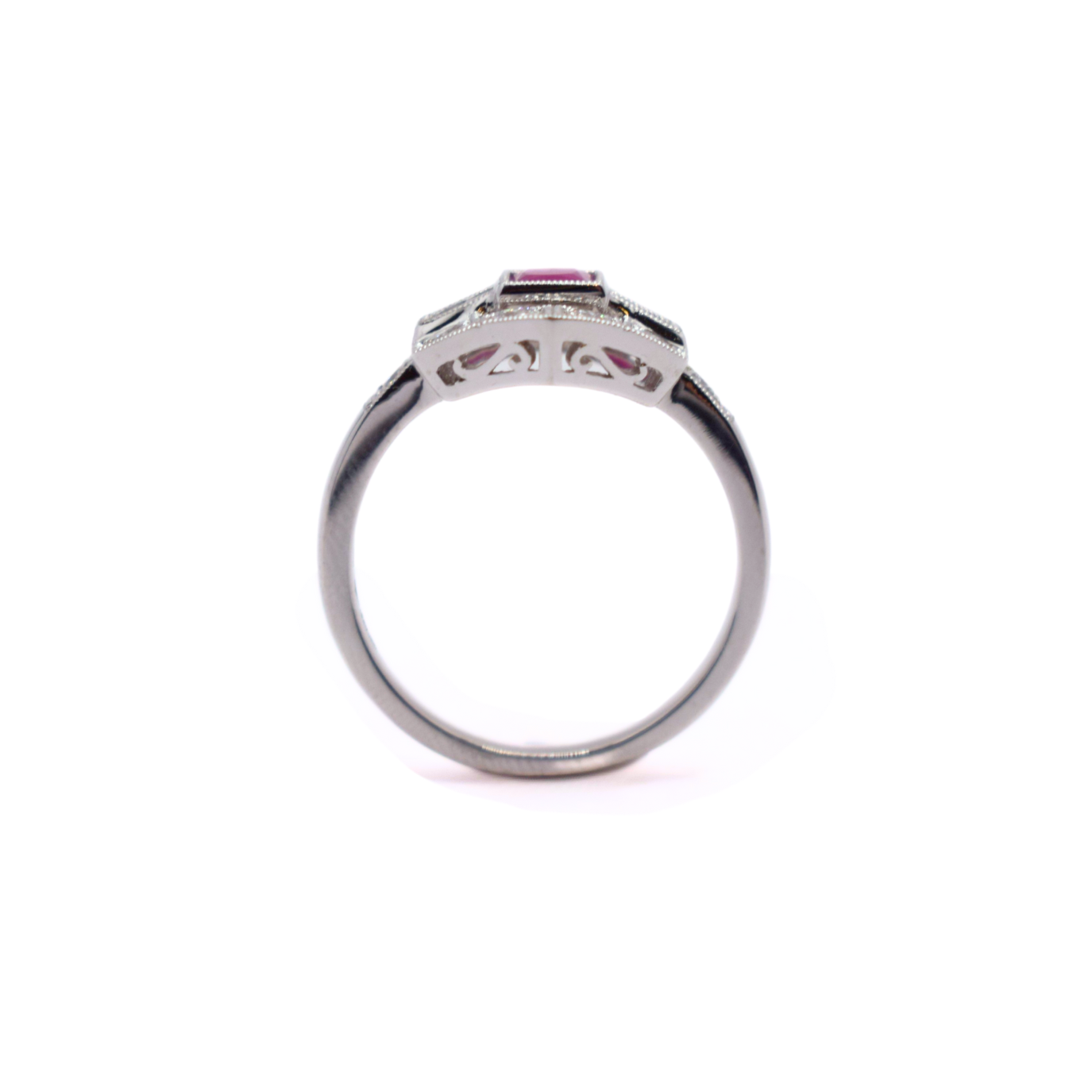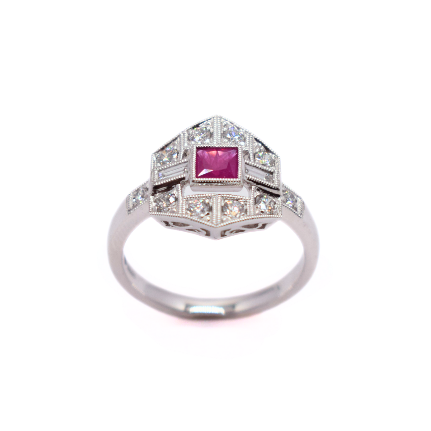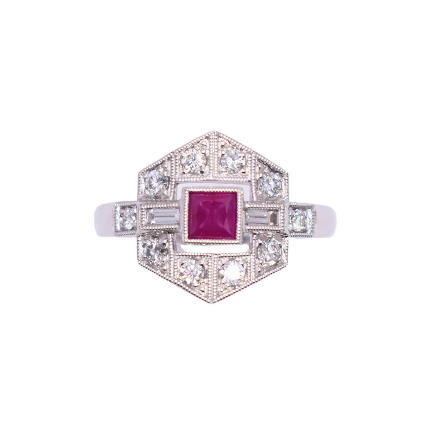 Platinum Ruby And Diamond Art Deco Inspired Cluster Ring. Grained Collett/ Bezel Setting Carrying One 4mm Square Ruby Set Between Two Baguette Cut Diamonds. There Are Ten Additional Round Brilliant Diamonds In A Millgrain Setting. The Cluster Forms A Hexagon Shape. Estimated Total Diamond Weight 0.60ct G Vs In Our Opinion, In Size O and can be resized up or down by 2 sizes.