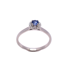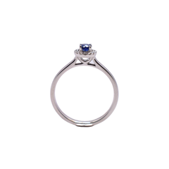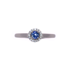 Platinum Sapphire And Diamond Halo Ring. Four Claw Setting Carrying One Round 3.5mm Darker Ceylon Coloured Sapphire. There Is A Micro Claw Set Diamond Halo Around The Sapphire Weighing 0.08ct. This ring has been created in a size N and can be resized up or down by two sizes.