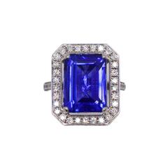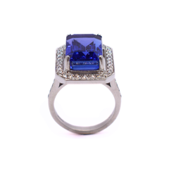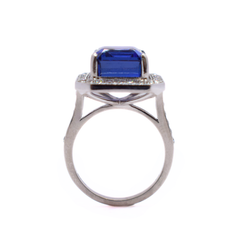 A breath-taking bespoke piece in Platinum, set with a 10.16ct emerald cut Tanzanite centre stone, surrounded by grain set round brilliant Diamonds across the halo design and shoulders, with an estimated total weight of 0.63ct. This ring has been created in a size M and can be resized up or down by two sizes.